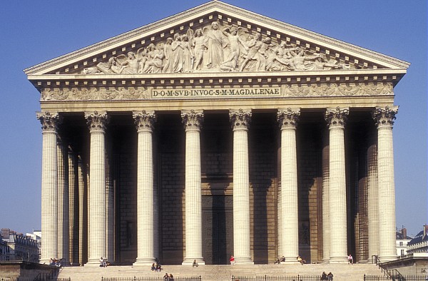 - La Iglesia de la Magdalena o Madelaine (1806-43) de Pierre Vignon, es la más representativa de este deseo de emular al arte clásico. El templo se levanta sobre un pódium clásico romano al que se accede por una amplia escalinata. Es un templo grecorromano octástilo, períptero y corintio hecho a gran escala. Pero el interior está adaptado al culto cristiano y posee una planta de cruz latina con cúpula. Vignon tomó como ejemplo el templo romano de Maison Carrée de Nimes.